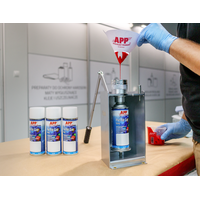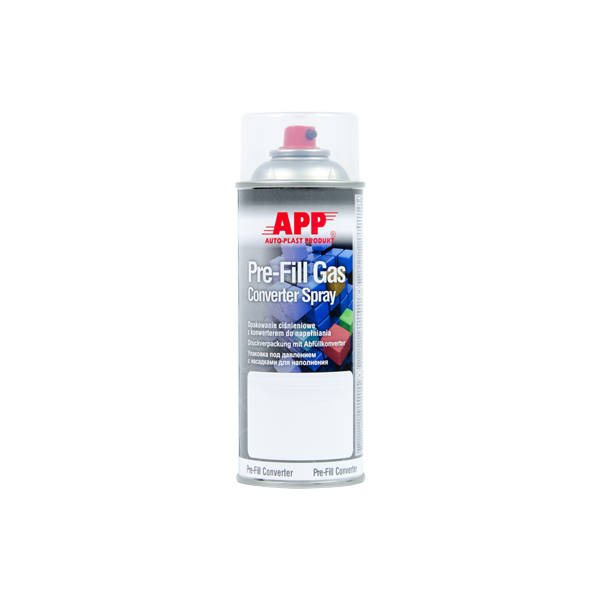 APP Prefill Gas Converter - аэрозольный баллончик под давлением. Содержит сжатый газ, органический разбавитель и преобразователь, который изменяет химический способ отверждения двухкомпонентной краски на отверждение испарением растворителя.