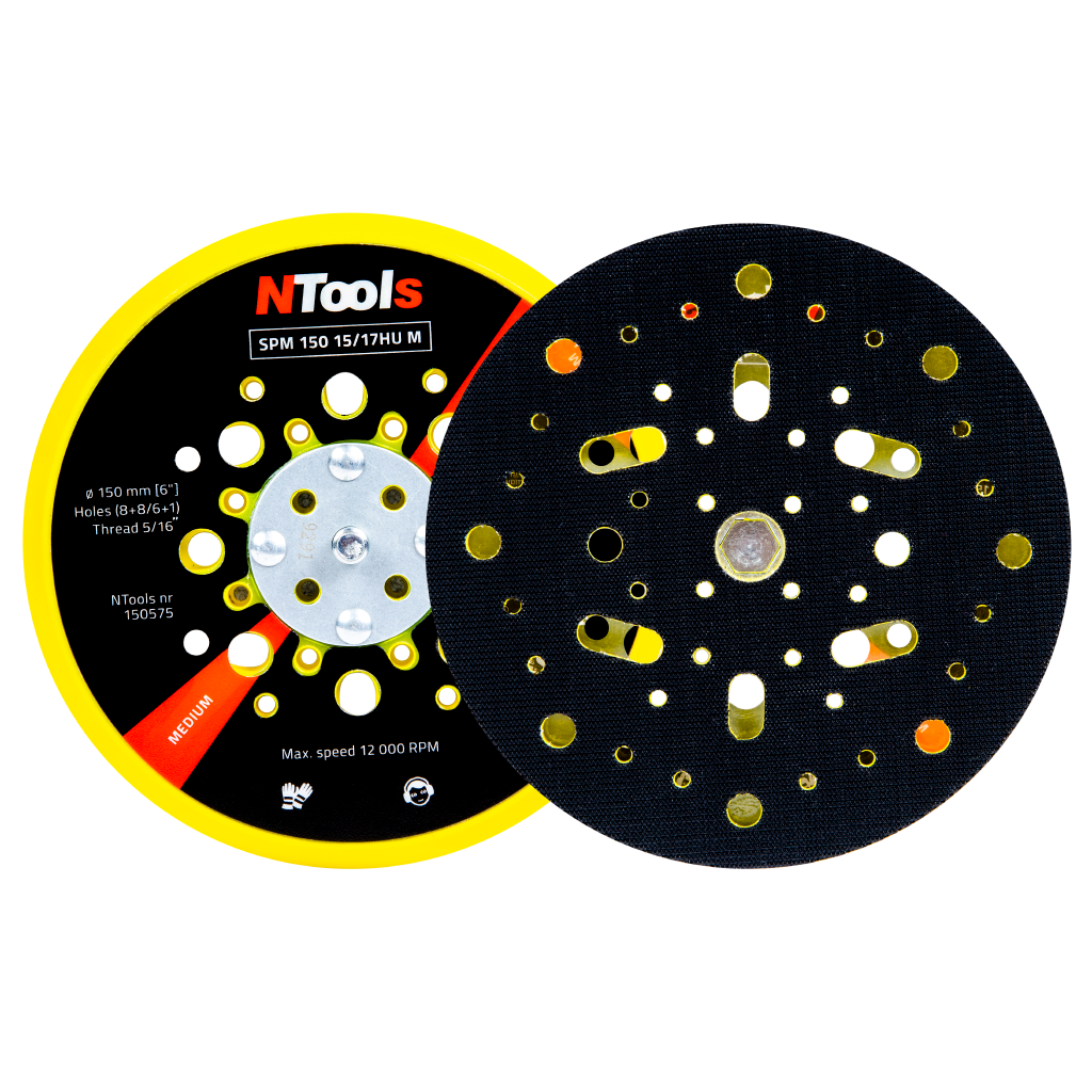 Рабочий диск с универсальным рисунком отверстий NTools SPM 150 15/17HU M диаметром 150 мм с прочной липучкой. Изготовлен из жесткого и гибкого желтого пенополиуретана толщиной 10 мм со шпилькой 5/16 ”UNF. Он предназначен для шлифовальных машинок NTools ROS 02E/05E и в качестве замены для шлифовальных машинок Mirka Deros, пневматических шлифовальных машин NTools RS и NTools AS и других с резьбовым креплением 5/16” UNF.