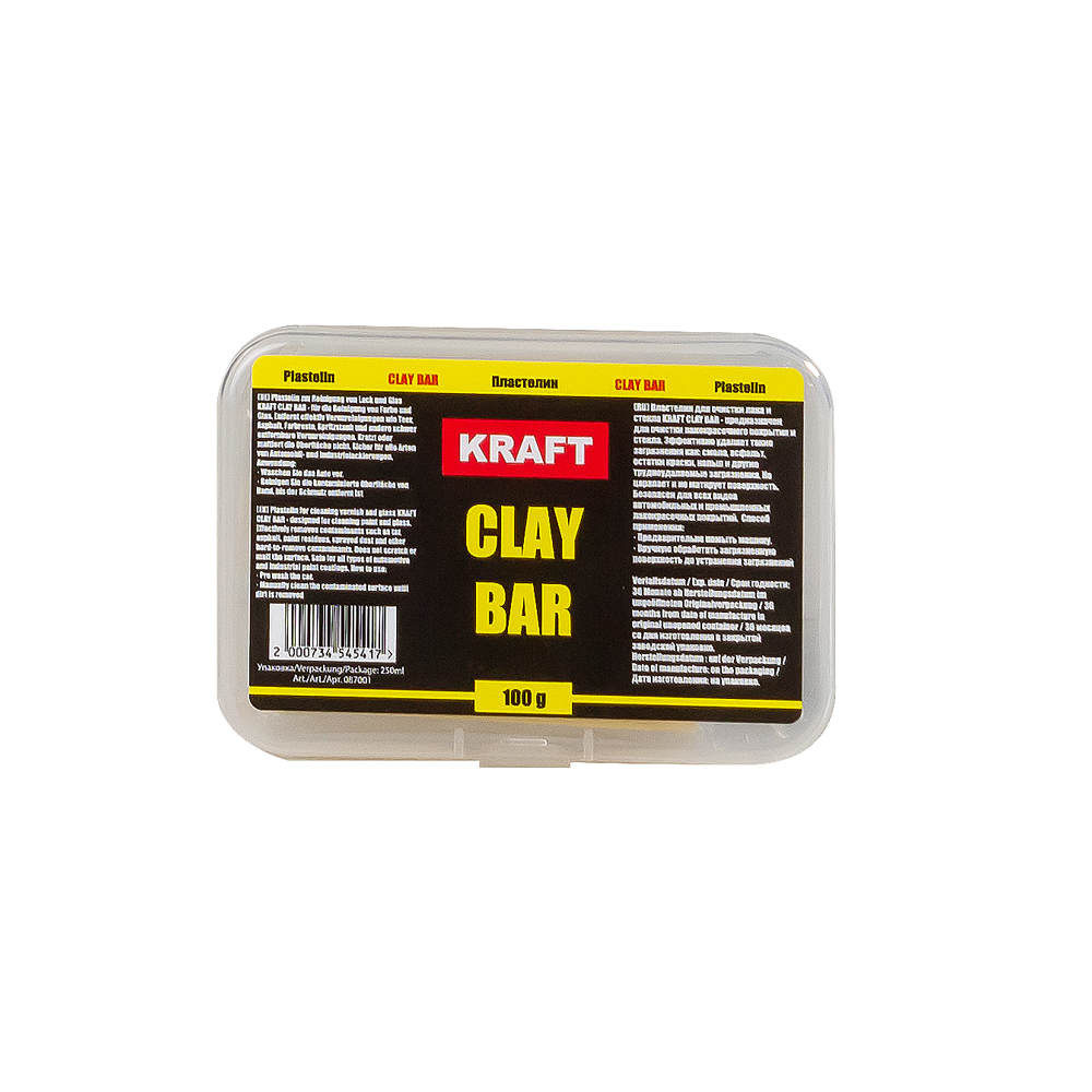Пластелин для очистки лака и стекла KRAFT CLAY BAR - предназна-чен для очистки лакокрасочного покрытия и стекла. Эффективно удаляет такие загрязнения как: смола, асфальт, остатки краски, напыл и другие трудноудаляемые загрязнения. Не царапает и не матирует поверхность. Безопасен для всех видов автомобильных и промышленных лакокрасочных покрытий.