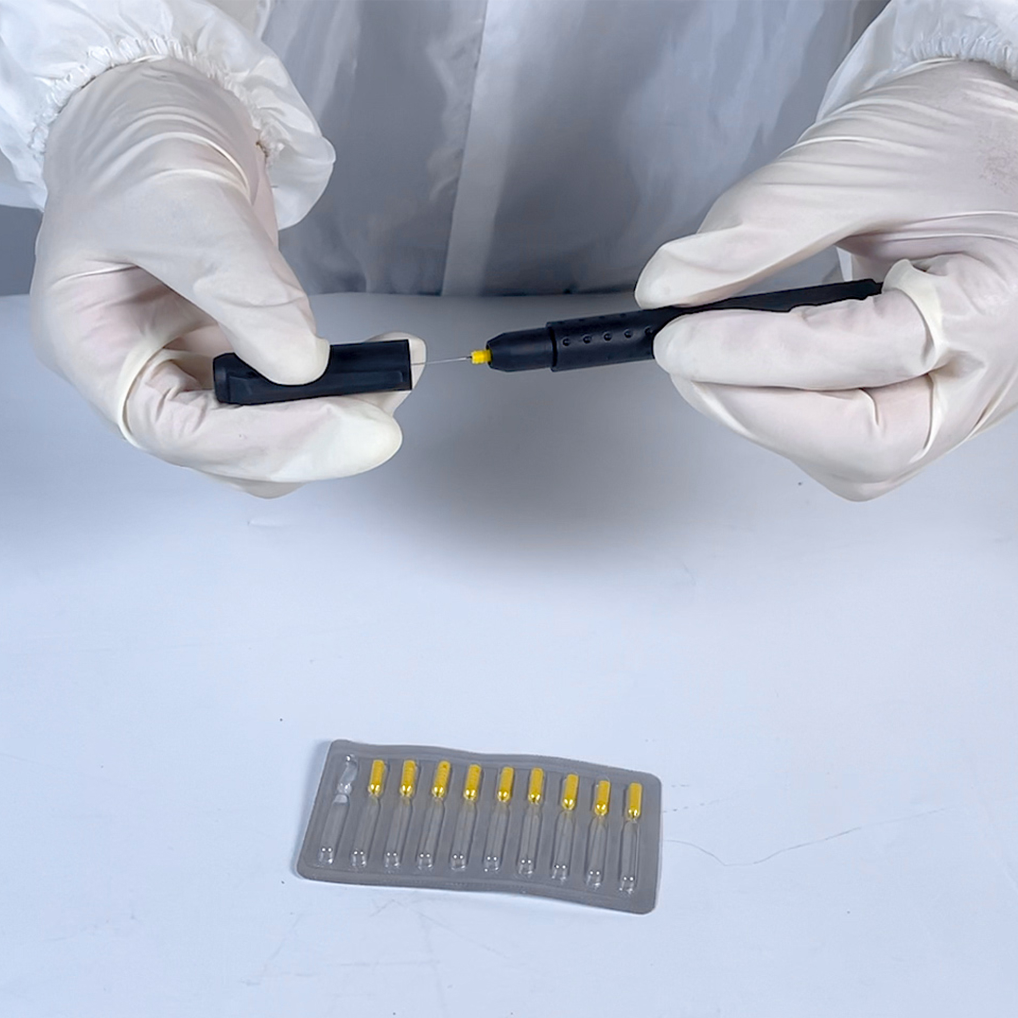 KRAFT DR SET — набор игл для удаления мусора с мокрого слоя финишного покрытия. Набор состоит из держателя в форме ручки и 10 индивидуально упакованных игл. Иглы, закрепляются в держателе, имеют микроскопические крючки, позволяющие эффективно захватывать и удалять пылинки, ворс, и другие загрязнения с влажной поверхности лака.