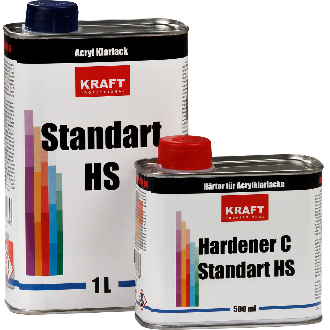 Прозрачный двухкомпонентный акриловый лак со средним сухим остатком. Лак высокого блеска, содержащий компоненты, защищающие от ультрафиолетовых лучей и пожелтения. Имеет очень хорошую текучесть и стекольную прозрачность. Характеризуется повышенной стойкостью к механическим, химическим и атмосферным воздействиям. Может использоваться как в обычных помещениях, так и в окрасочных камерах. Можно покрывать как обычные, так и водорастворимые краски. Также есть лак с ускоренным временем сушки KRAFT STANDARD HS FAST.