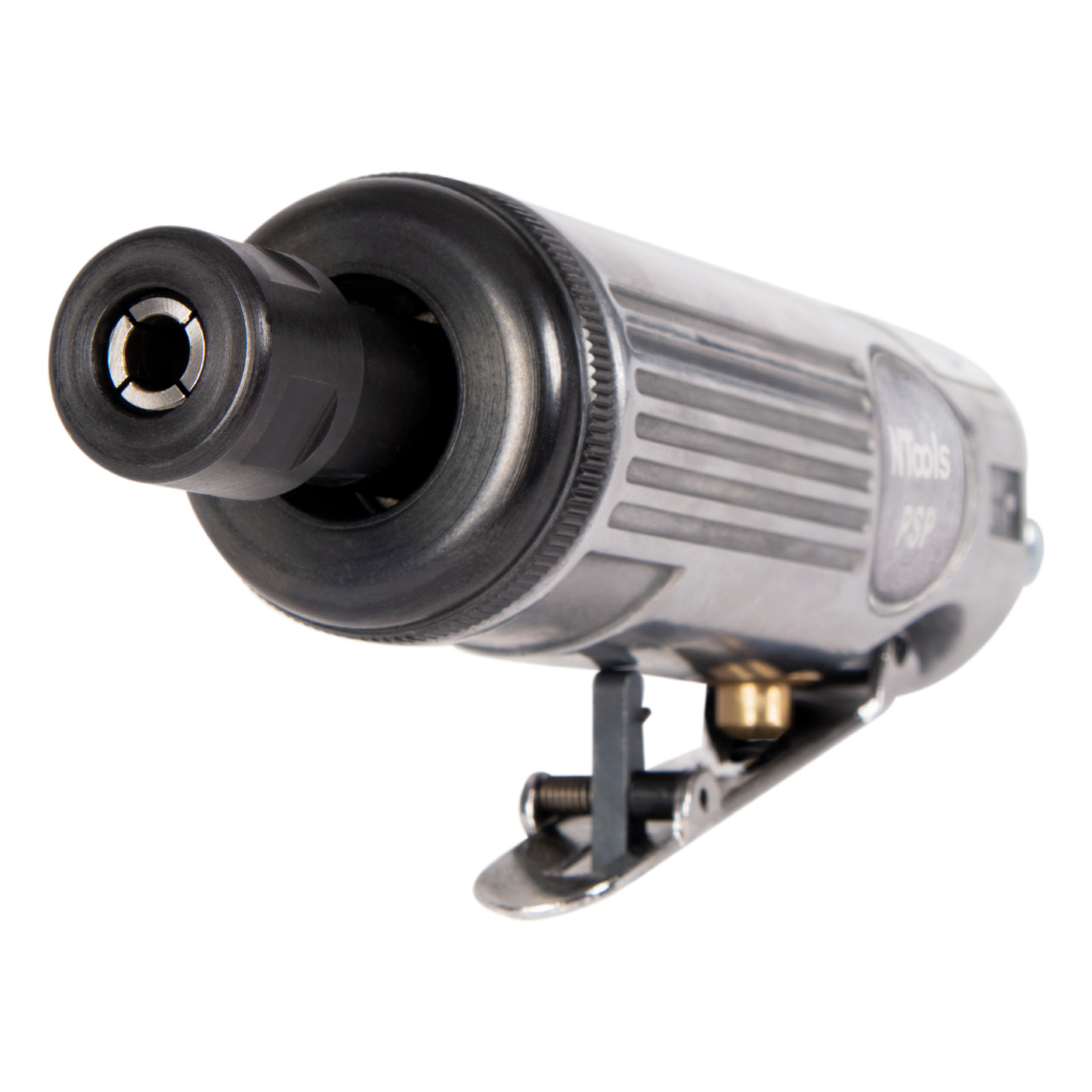 Пневматическая прямошлифовальная машинка – короткая, удобная, мощная. Имеет простое строение и рычажный клапан безопасности (HV), предохраняющий от случайного включения. Выход воздуха в задней части рукоятки не создает пыли на рабочем месте. Цанга для крепления инструмента 6мм.