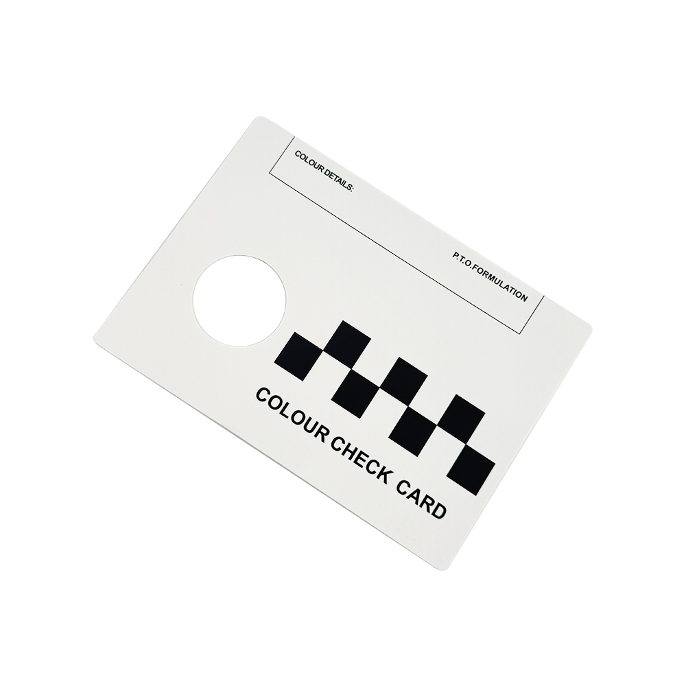 Бумажная карта для тест-напыла. Позволяет осуществить контрольный напыл для визуализации цвета в условиях пневматической окраски и произвести контроль укрывистости. Изготовлены из непромокаемой бумаги. На лицевой стороне имеют шешечки для контроля укрывистости, отверстие для сверки с цветом оригиналом. На оборотной стороне имеется формуляр для заполнения мнформации о цвете, автомобиле и рецепте краски.