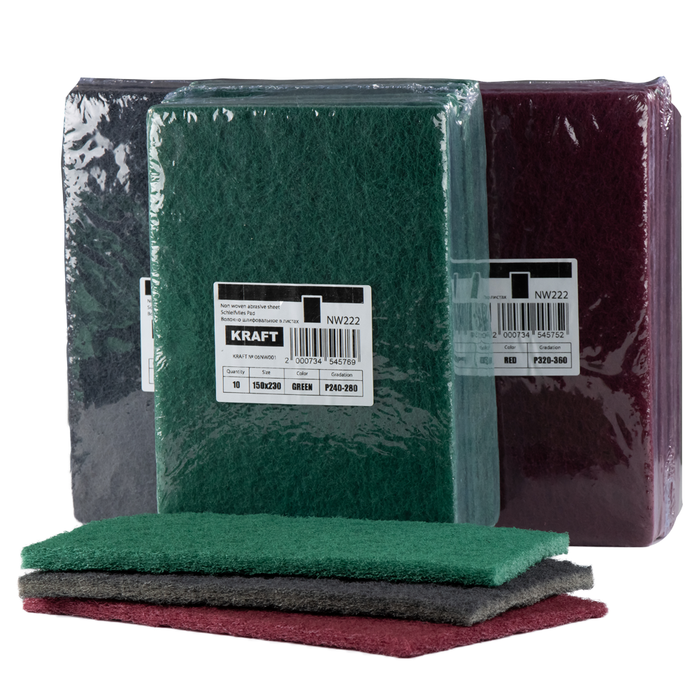 Волокно шлифовальное KRAFT NW222 – абразивный нетканый материал. Имеет открытую трехмерную структуру из нетканых нейлоновых волокон, пропитанных смолой, с напылением высококачественного абразивного материала. Позволяет значительно ускорить подготовительные работы (матирование поверхности).